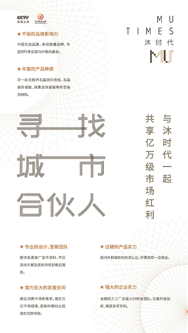 2018年,经过重重审核,沐时代荣登央视平台,被选为「中国优选品牌」,并作为「央视展播品牌」在央视轮播展示。在2019年3月的上海国际地材展上,沐时代凭借优异的产品性能和别致的花色,吸引了来自印度、韩国、日本、荷兰、美国、西班牙等多国友人的咨询。尤其是沐时代独家推出的石晶锁扣墙板,许多专业观众在仔细咨询了解后,当场就表达出强烈的合作意向。