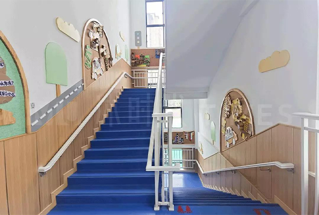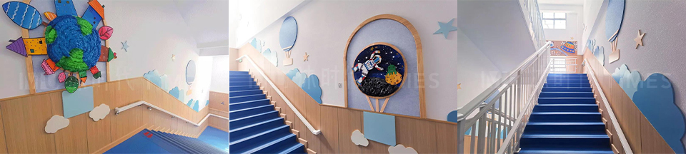 墙面上的各种画面,依旧是一道靓丽的风景线,与走廊中的画面自然衔接,保证了空间设计感的完整,也能让儿童们在上下楼梯时感受到乐趣。