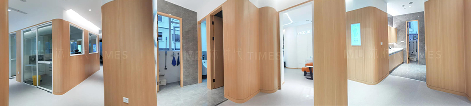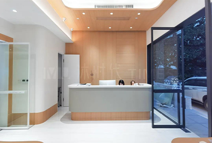 诊所内部由纯白色和原木色作为主色调,原木部分全部由碳晶饰面板实现,分别应用于吊顶、柱体与墙面。